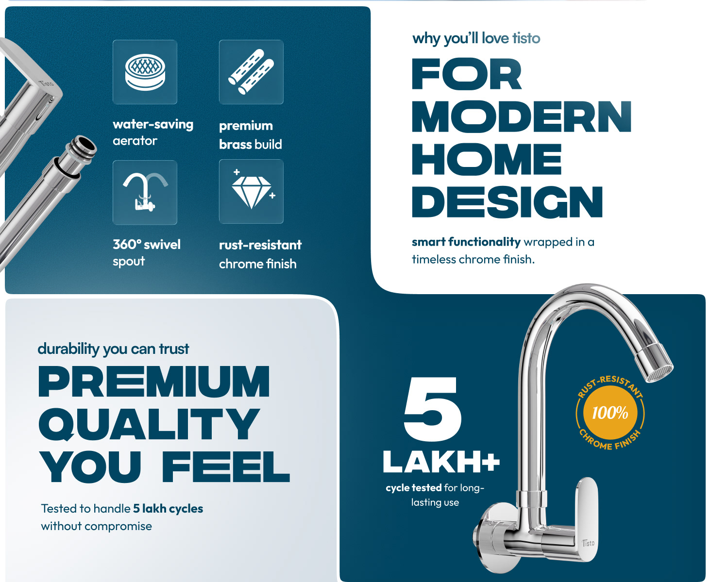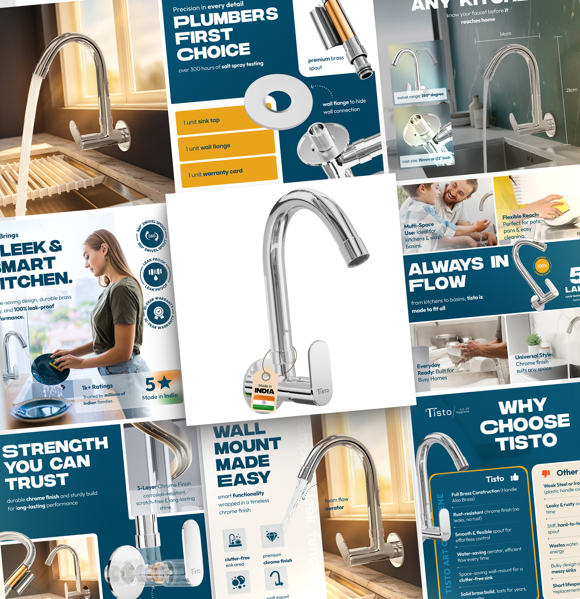 Tisto, an India-based brand selling water taps and kitchen accessories, approached us to create high-quality 3D product renders, Amazon listing images, and Premium A+ (EBC) design. Our process included research on products, audience, and competitors, followed by content blocks and wireframes built with the AIDA framework to drive conversions,