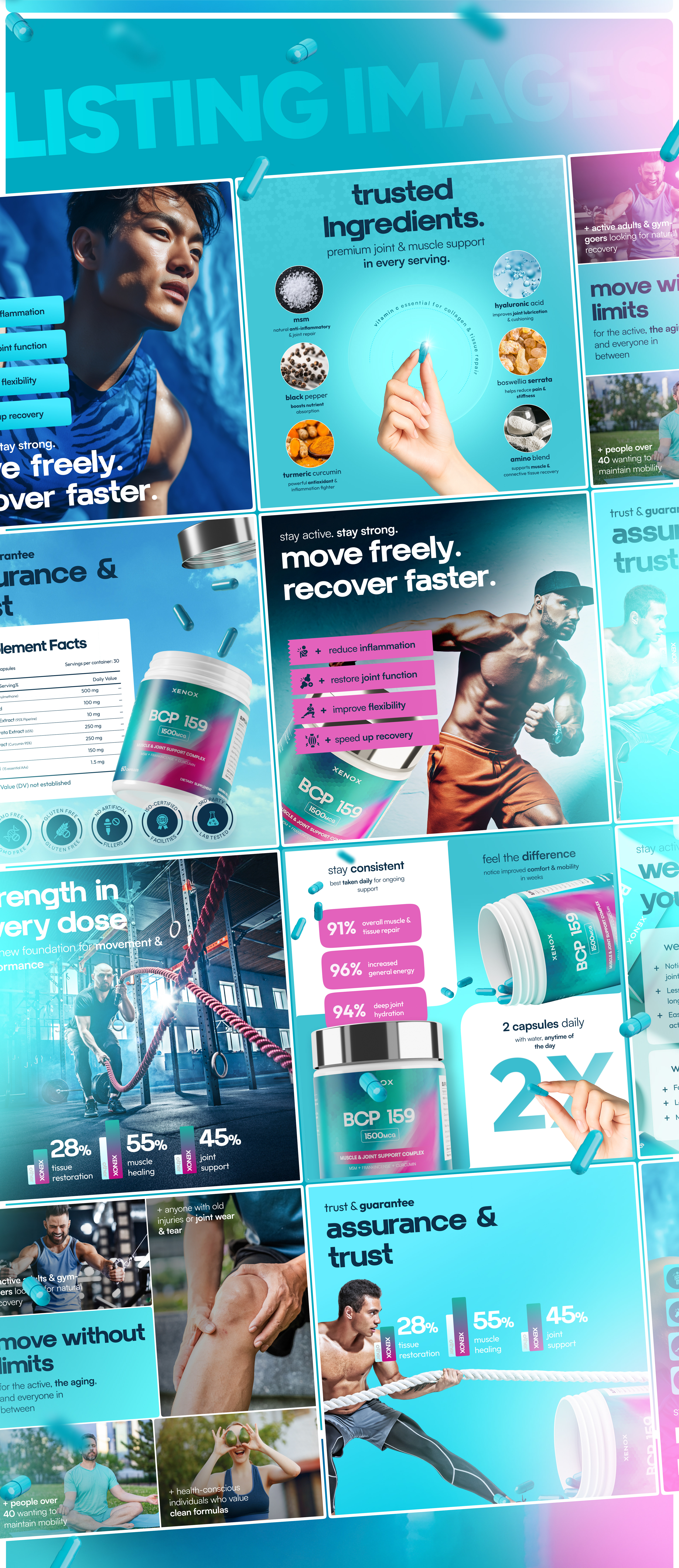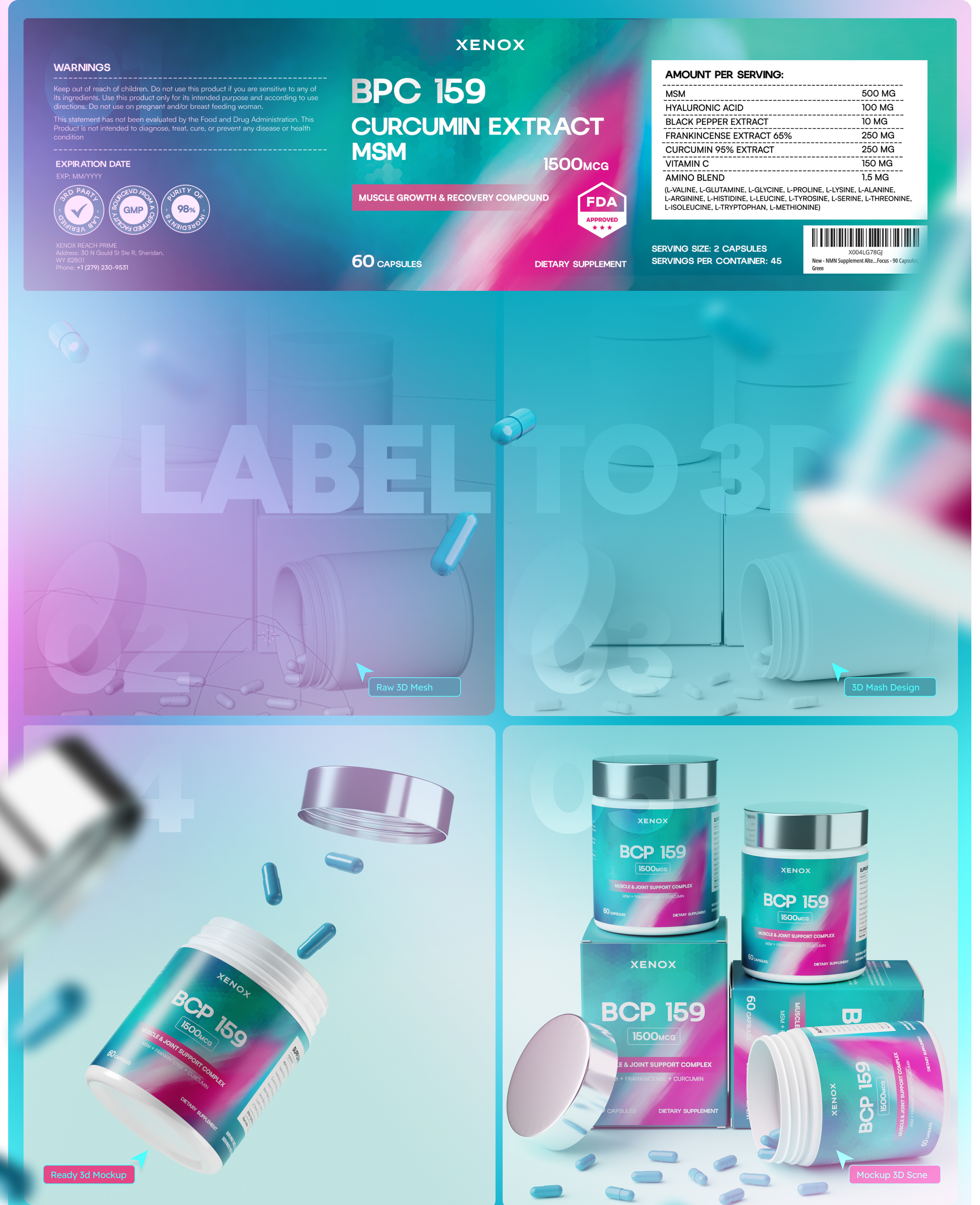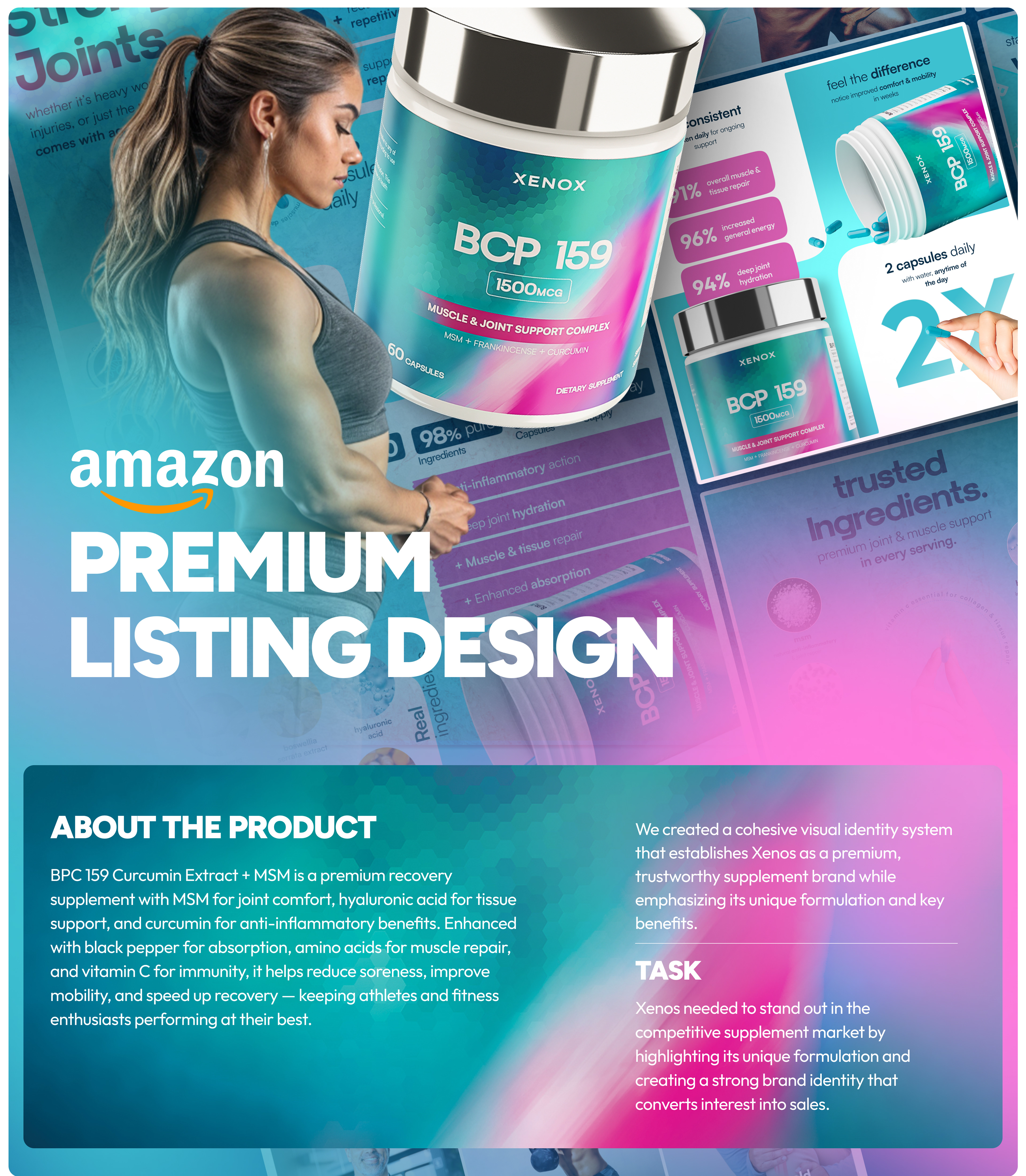 For Xenos, we developed a complete brand identity package to position it as a premium, trustworthy supplement brand. Our scope included branding, label design, 3D product modelling, Amazon listing images, and Premium A+ content. We created a cohesive visual identity system that not only highlights Xenos’ unique formulation but also clearly communicates its key benefits. From clean, modern packaging to photorealistic renders and conversion-focused Amazon visuals, every element was designed to build credibility, engage customers, and elevate Xenos above competitors.