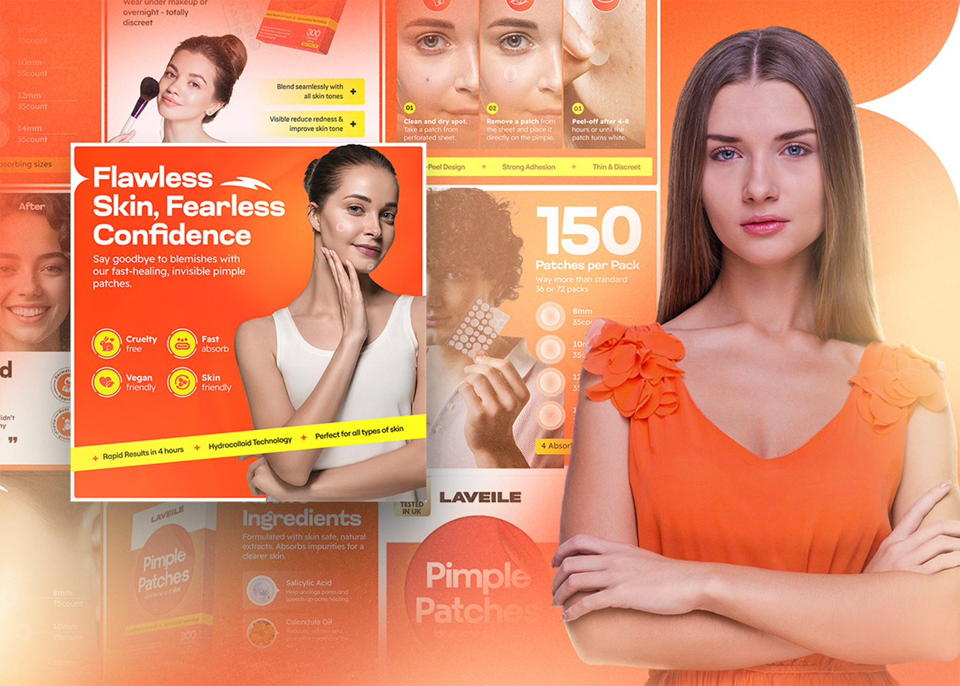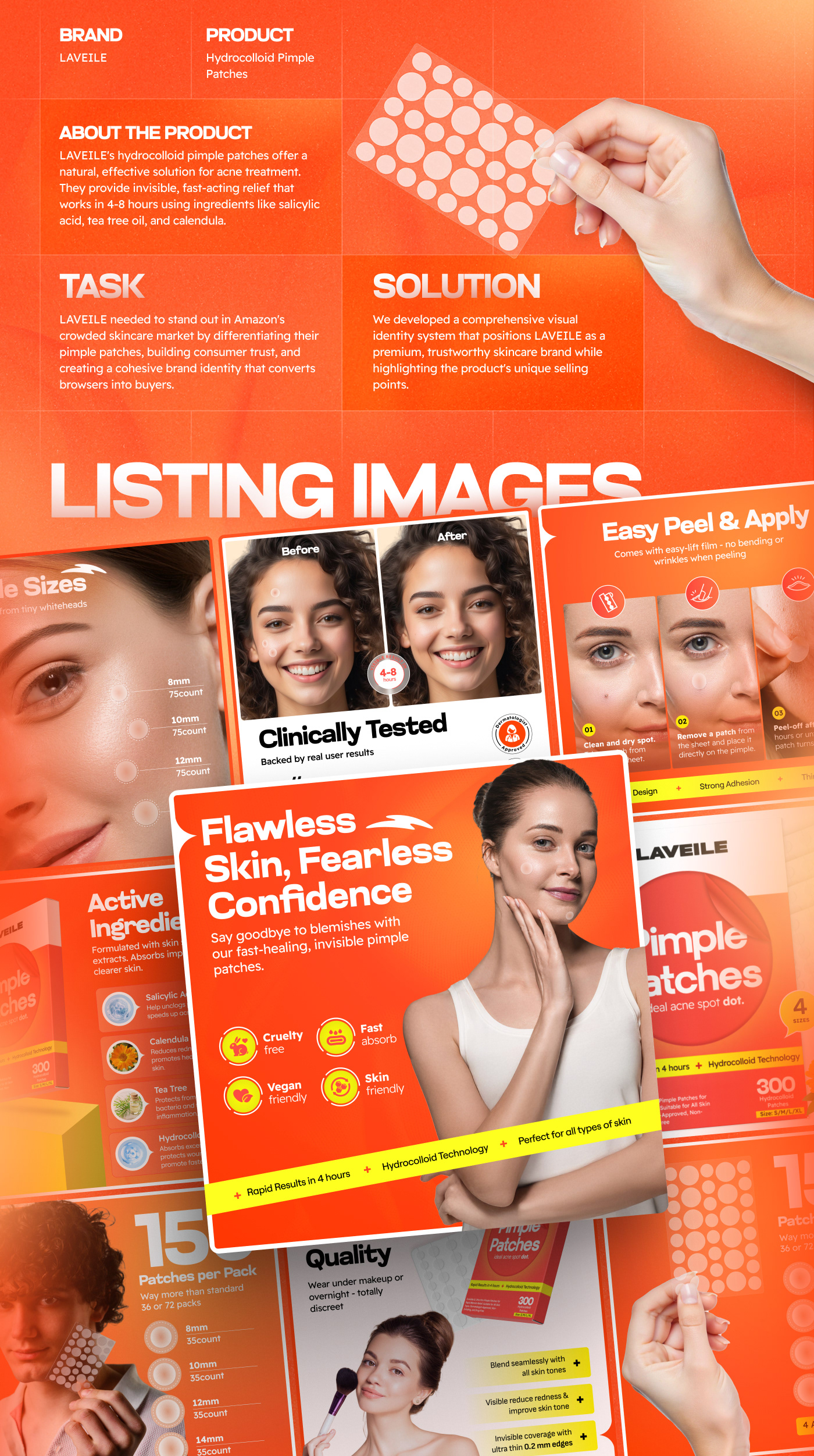 Project Overview – Pimple Patches This project showcases how we deliver amazing design solutions tailored for Amazon success. Starting with packaging design, we created a clean, modern aesthetic that reflects the product’s purpose and appeals to the skincare market. We then developed a high-quality 3D model of the product to ensure consistency and photorealism across all visuals. Using this model, we designed Amazon listing images that communicate benefits clearly, supported by a strong visual narrative. To elevate the brand further, we crafted Premium A+ Content Design, combining compelling visuals with customer-focused copy to drive conversions. We also designed a cohesive Brand Story section, reinforcing the brand’s identity and trust with Amazon shoppers. From concept to execution, every element was thoughtfully designed to enhance brand presence and deliver an engaging customer experience.