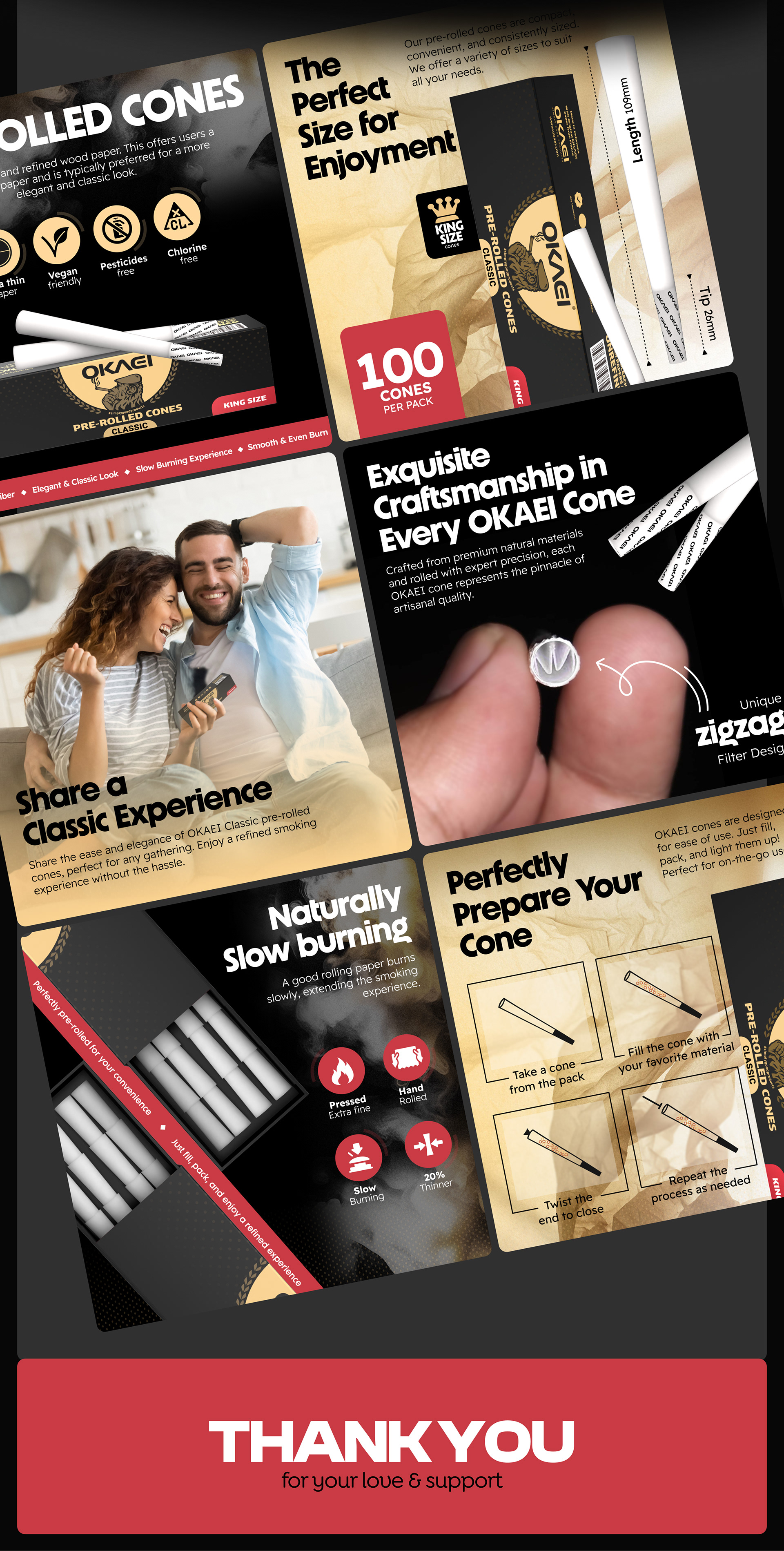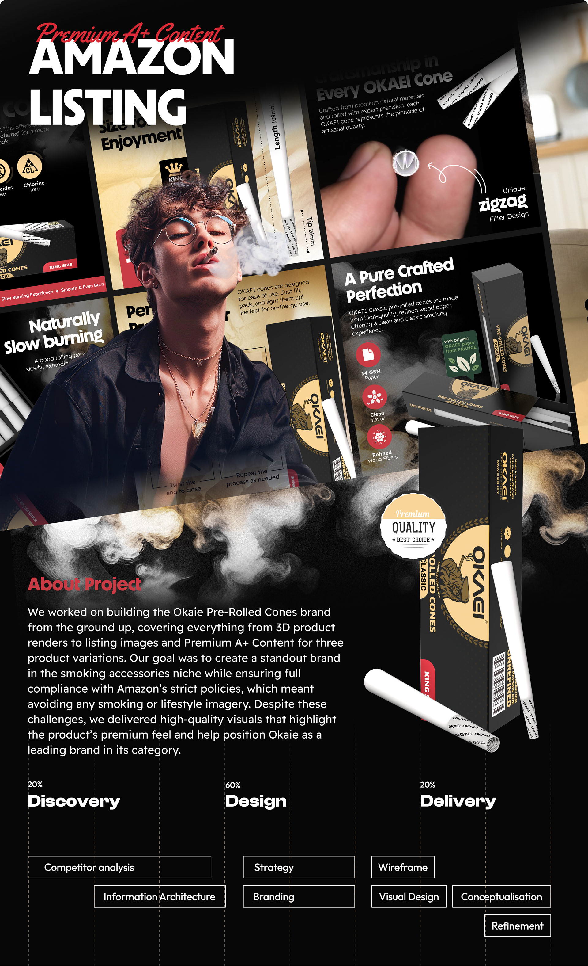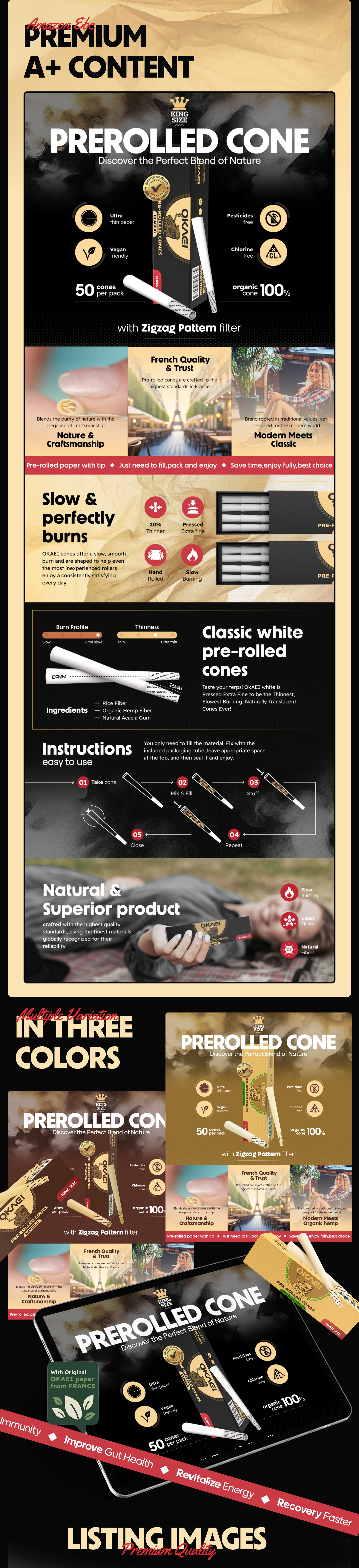We worked on building the Okaie Pre-Rolled Cones brand from the ground up, covering everything from 3D product renders to Amazon listing images and Premium A+ Content design for three product variations. Our goal was to create a standout brand in the smoking accessories niche, emphasizing high-quality visuals that resonate with the target audience. While ensuring full compliance with Amazon’s strict policies, we successfully avoided smoking or lifestyle imagery while maintaining the brand's integrity. Despite these restrictions, we delivered premium product visuals and a strategic design approach that highlighted the product’s high-end appeal. This helped position Okaie Pre-Rolled Cones as a trusted and leading brand in the smoking accessories category.